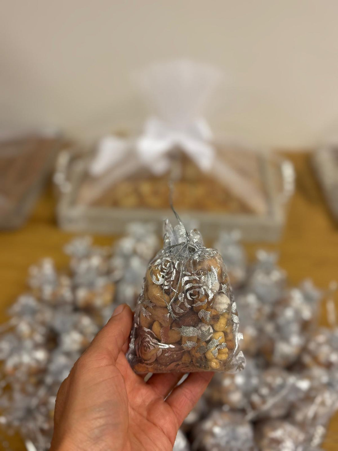 Notenmixen in geschenkzakjes A: Borrelmix in kadozakjes Gold/Zilver - 70 gram inhoud: Borrelnoten festival/Mais geroosterd...